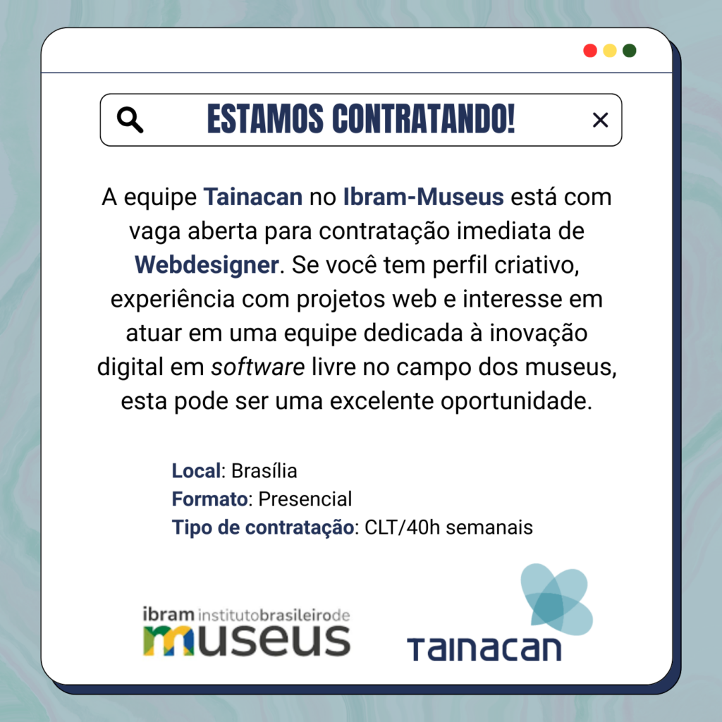 A equipe Tainacan no Ibram-Museus está com vaga aberta para contratação imediata de Webdesigner.